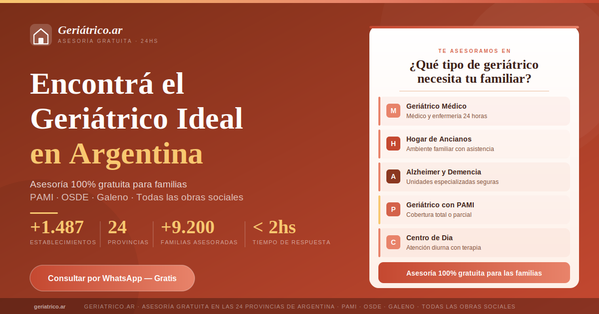 | +1.487Geriátricos Verificados | 24Provincias Cubiertas | 100%Habilitados Oficialmente | +9.200Familias Asesoradas | <2hsTiempo de Respuesta |